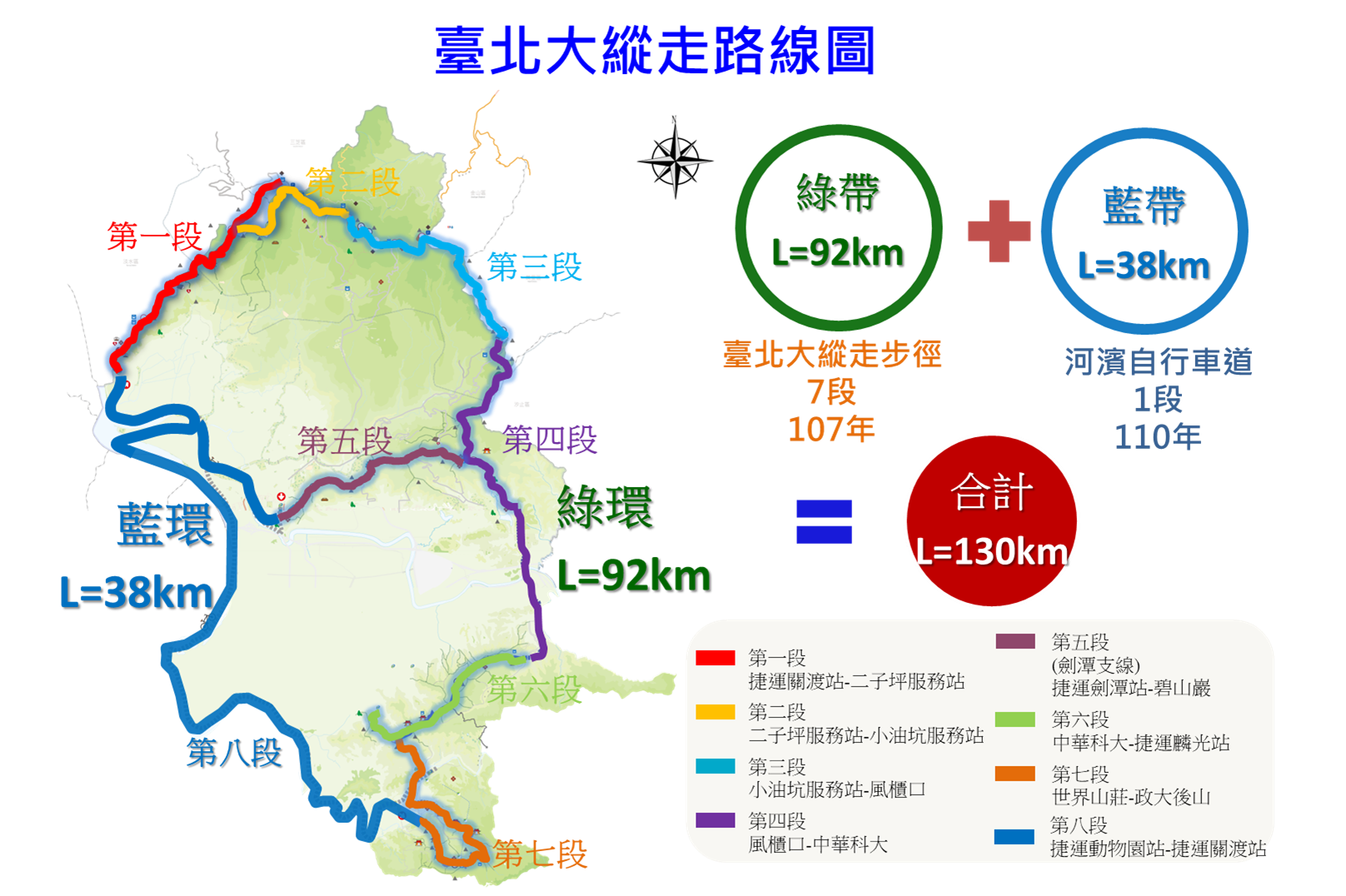除了山系縱走,從水系擁抱臺北市最好的選擇便是河濱自行車專用道。於是有了7+1中的唯一水系步道: